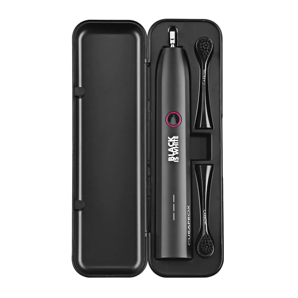 Sonična zobna ščetka Black is White Hydrosonic v mat črni barvi. Nastavki Carbon prav tako črni in prevlečeni z delci aktivnega ogljika, ki zagotavlja nežno, a učinkovito odstranjevanje madežev z zob.